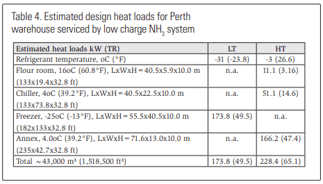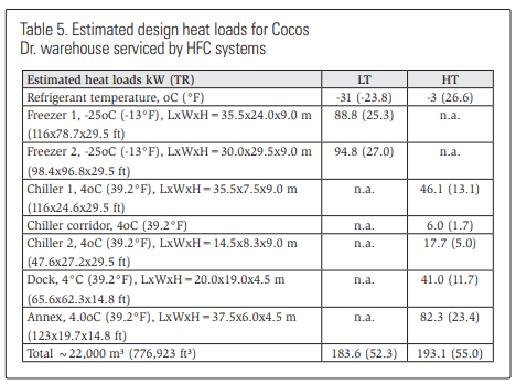 The second facility is referred to as the Cocos Dr. warehouse. The Cocos Dr. warehouse is serviced by industry standard, individual air-cooled HFC-based, single- stage condensing units with electric defrost in the low-temperature areas. Tables 4 and 5 show the design refrigeration loads for the Perth and Cocos Dr. distribution centers. Clearly the sum of the design refrigeration loads for the two distribution centers are similar.