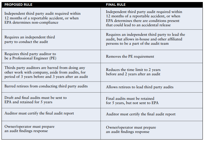 One of the proposed provisions that created the most concern from industry was the requirement for independent third party audits after a reportable accident. The changes to the Final Rule address some of the concerns raised by IIAR and its coalition partners. For example, the PE requirement has been eliminated and retirees will not qualify to lead third party audit teams. However, the fundamental nature of the new policy has not changed and IIAR continues to have concerns with the requirement to force independent third party audits and that third-party firms doing work outside auditing would be disqualified if they had conducted business with the company within two years of the audit in question.