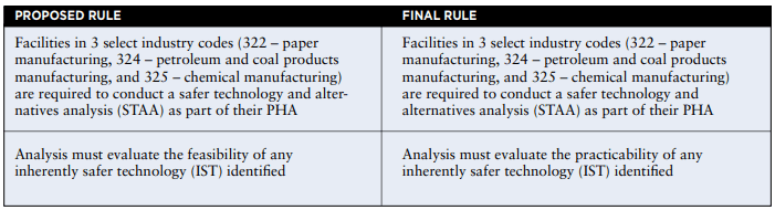 The biggest change to the Safer Technologies and Alternatives Analysis provision in the Final Rule is the shift from evaluating the “feasibility” to the “practicability” of implementing identified inherently safer technologies. This is an improvement, as some identified technologies may be feasible to implement, but not be practical.