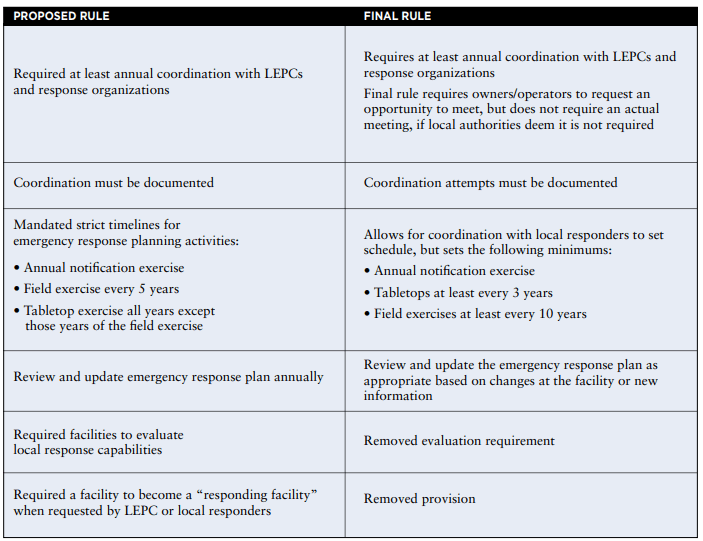 The Final Rule removes several burdens on regulated facilities and emphasizes the importance of coordination between LEPCs/local responders and facilities to work out the details of response exercises.