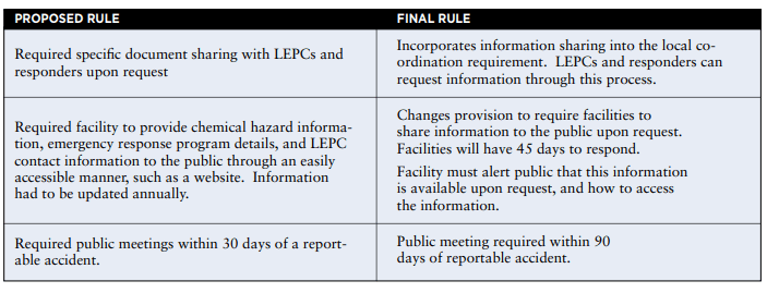 The Information Sharing provisions are improved in the Final Rule by relying on coordination between facilities and LEPCs/local responders to determine information sharing needs. It also eliminates the requirement of public posting of chemical hazard information and making such information available upon request. The extension of the time period to 90 days for a public meeting after a reportable accident is also an improvement.