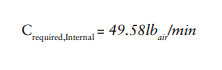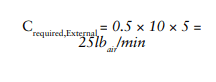 Since there is an isolation valve in this suction line within a foot of the jacket nozzle on the tank, the connection must be made within six inches of the tank suction outlet. However, the alcove of this tank where the operator inspects it and makes connections to pump product in and out of the tank is on the second floor of the facility, so the tank is mounted on a steel framework, putting this nozzle out of reach of the refrigeration operators. So, upon installing this tank, the operators decide to extend the relief valve inlet piping up to the roof to facilitate the inspection and maintenance of the relief valves. They install 25 ft of 1” piping, with one 90° elbow, and a three way valve with a Cv of 13.95 gpm/psi. When we calculate the de-rating of the relief valve capacity, we find that the adjusted capacity is 43.44 lbair/min, which is inadequate to cover our required relief capacity.