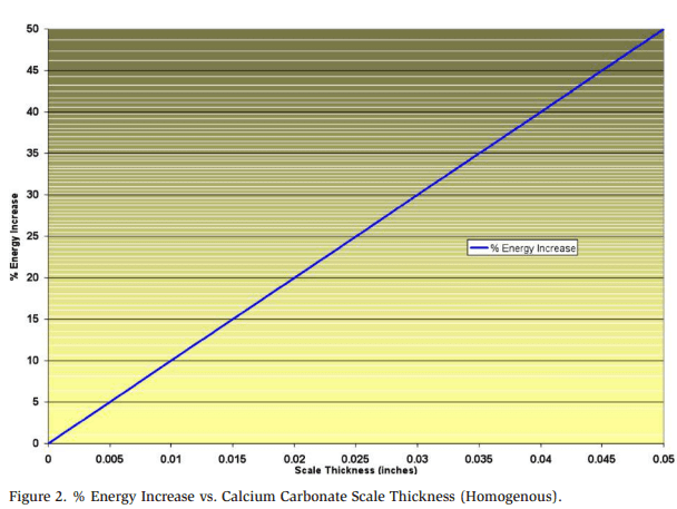 Scale formation is also a major concern in ammonia condensers. Scale formation is due to precipitation of ions. Depending on the water source, there are a variety of deposits that can form. The most common is calcium carbonate and calcium phosphate. Calcium carbonate is hard tenacious scale that forms on the coil and walls in the system. Calcium carbonate is an insulator so when it forms on the surface of the coil, it reduces heat transfer. Figure 2 shows the increase in energy required compared to the thickness of the calcium carbonate scale. Calcium phosphate is a soft deposit that typically fouls systems and ends up settling out in the basin or in some instances heat exchangers. Calcium and magnesium are hardness salts. These two ions are inversely soluble with temperature. Thus as the temperature of the water increases the less soluble the calcium and magnesium become. This in combination with high concentrations of calcium will lead to precipitation. In ammonia condensers, systems are cycled to reduce water and chemical usage. Cycling of the system is simply the concentrating of the ions from the makeup water. As water goes over the coil, some is evaporated. Only pure water evaporates. The remaining water still has the original number of ions and thus begins to cycle as new water is added. When the water in the system reaches 2x the makeup water it is then said to be at 2 cycles of concentration. This continues to climb until an equilibrium is hit or a blowdown control is set to limit the levels. As the calcium levels continue to cycle, they will reach solubility limits and thus begin to precipitate.