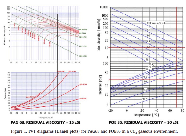 The most widely used lubricants in CO2 applications are polyolester (POE) and polyalkylene glycol (PAG) [2]. From a compressor perspective, both lubricants should be evaluated using Daniel plots that describe the pressure-viscosity-temperature (PVT) behavior of CO2 and the given lubricant. These plots allow for visually checking the amount of refrigerant dissolved into the lubricant and the viscosity drop experienced by the lubricant during its actual operation in the compressor sump.