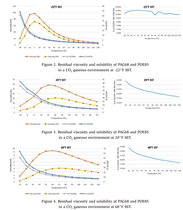 The previous figures show that PO85 absorbs more gaseous CO2 than PAG68 under all operating conditions. This result suggests that PAG68 is a more effective lubricant, as also indicated by the residual viscosity graphs, which show that PAG68 always exhibits higher residual viscosities. However, the real, practical compressor operating conditions should be considered because such conditions result in drive gears experiencing oil temperatures between 60°C and 80°C (140–176°F). Hence, in addition to PAG68, POE85 provides an acceptable residual viscosity at low and medium SST (e.g., -22°F SST and +20°F SST). Nevertheless, if higher SST values are considered (e.g., in the case of heat pumps, with 68°F SST), POE85 is no longer an option because it results in low residual viscosity.