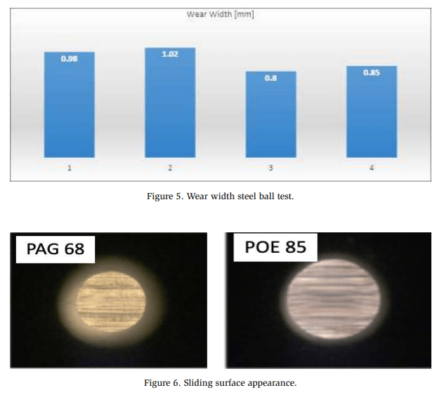 The figures below illustrate the results of the laboratory steel ball wear tests, using POE85 and PAG68. The figures show the wear width and sliding surface appearance obtained in the tests at pressures of 70 bar (1015 psi) and 80 bar (1160 psi).