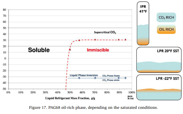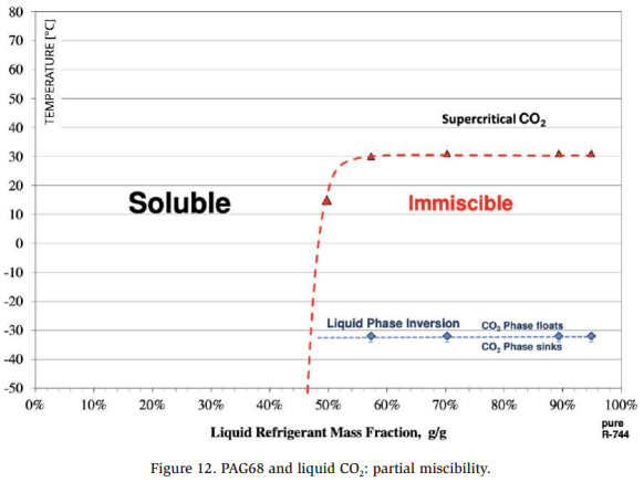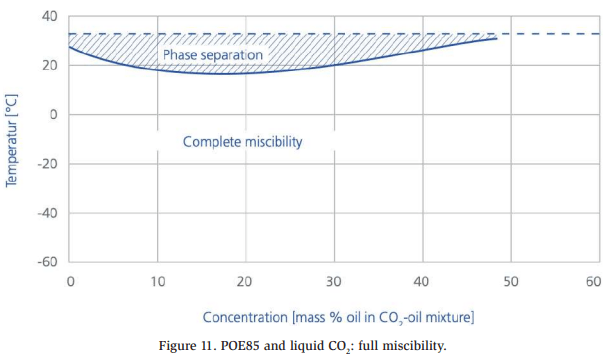 While POE85 is fully miscible with liquid CO2 in the most common evaporating temperature ranges [4], PAG68 is only partly miscible [5], as shown in the figures below.