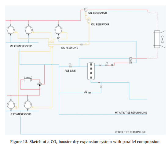 The most typical dry expansion (DX) CO2 system architecture is represented by a booster flash gas bypass execution, which can be improved from an efficiency standpoint by adding parallel compression [6]. The figure below shows a simplified sketch of a booster parallel compression system, including the oil management strategy.