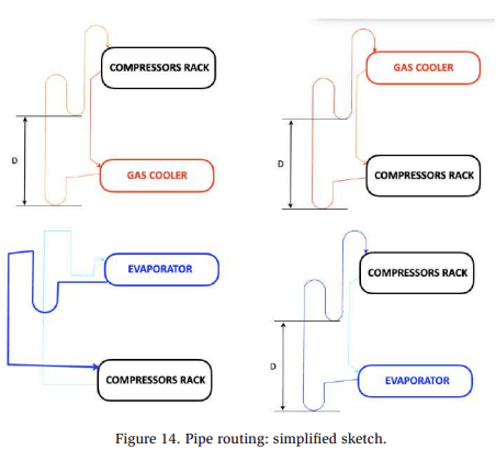 In addition, pipe runs should be properly executed to ensure that oil returns from the gas and utilities to the rack. The following figure provides some indications in this sense.