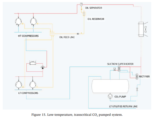 Pumped CO2 execution is quite popular in industrial refrigeration systems or winter sports venues, such as ice-skating rinks. In such systems, liquid CO2 circulates into the evaporators and accumulates in a low-pressure drum. When the drum pressure increases, compressors are engaged to maintain the drum pressure at the desired level. The figure below presents a simplified sketch of a low-temperature, transcritical CO2 pumped system.