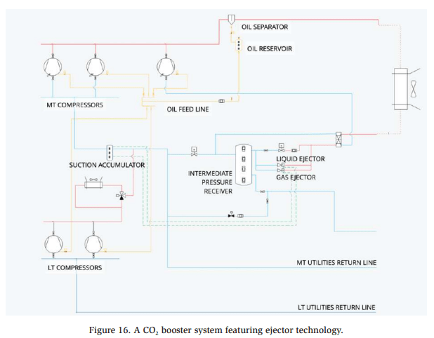 The performance penalties of using CO2 have been questioned in the case of high ambient temperature operations. This is especially concerning regarding the overall COP of the system. Therefore, this issue has been tackled with the implementation of numerous technical solutions, such as ejectors, since 2013 [6]. A typical CO2 booster system layout, including ejectors, is shown in the figure below.