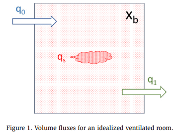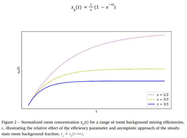 In practice, real rooms are not ideally mixed owing to dead space(s), physical obstructions, or general inefficiencies in the ventilation flow patterns relative to the release location and geometry. These non-idealities may be broadly addressed by introducing a dimensionless room background mixing efficiency, ε, which is typically less than unity: