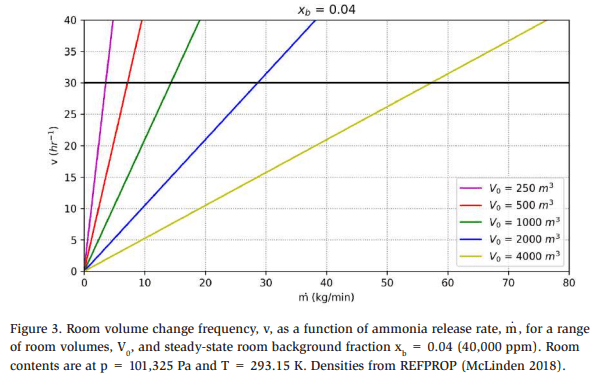 Additionally, Figure 3 illustrates the volume change frequency, v (hr-1), required to achieve a steady-state room fraction of xb = 0.04 (40,000 ppm, ¼ LFL) as a function of the constant gas mass release rate, m. (kg/s), for a range of room volumes, V0. Often, real refrigeration system ammonia gas release source terms are more complex for releases with a condensing liquid fraction that may pool and subsequently vaporize at a varying rate. The all-gas simplification is used in an ideally mixed room to illustrate the relationship between gas mass flow and ventilation volume discharge rates required to maintain the ammonia room background fraction below the IIAR-2 required detection and de-energization limit of 0.04.