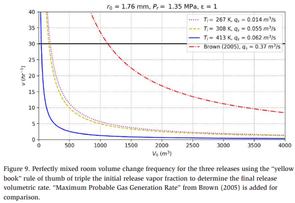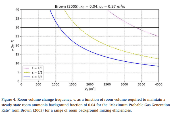 Figure 4 shows the room volume change frequency required to maintain a steadystate room ammonia background fraction of 0.04 as a function of room volume for the “Maximum Probable Gas Generation Rate” from Brown (2005), using a range of room background mixing efficiencies. For the ideally mixed room scenario, ε = 1, developed by Brown, room volumes greater than ~1100 m3 are capable of remaining below the 0.04 volume fraction (40,000 ppm, ¼ LFL) required for ventilation rates at or below 30 volume changes per hour.