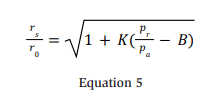 For choked flow, rs in the Vz equation (Equation 3) is not an actual hole radius but the radius of a theorized pseudo-source, which is somewhat larger, as illustrated in Figure 5. Webber (2011) notes that there are numerous estimates proposed in the literature for the ratio of physical and pseudo-leak radii, rs /r0, which is used to simplify the complex nature of the multiple shock zones seen in the Schlieren visualization (Figure 5). Webber (2011) suggests using the following “pragmatic approach” for the pseudo-source relationship.