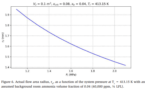 Figure 6 shows the combined results obtained using Equations 3–5 to calculate the (actual) flow area radius, r0, as a function of the system pressure at Tr = 413.15 K with an assumed background room ammonia volume fraction of 0.04 (40,000 ppm, ¼ LFL). For Pr = 1.35 MPa, r0 = 1.76 mm.