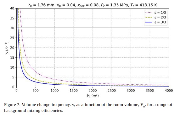 Finally, the sub-cooled liquid release is considered, as shown in Table 1, column 3. The overall release rate is almost twenty times larger than the vapor release rate shown in Table 1, column 1. Applying the “Yellow Book” rule of thumb returns an estimated aerosol mass flow rate of 0.088 kg/s. Figure 9 shows the room volume change frequency for the different release cases.
