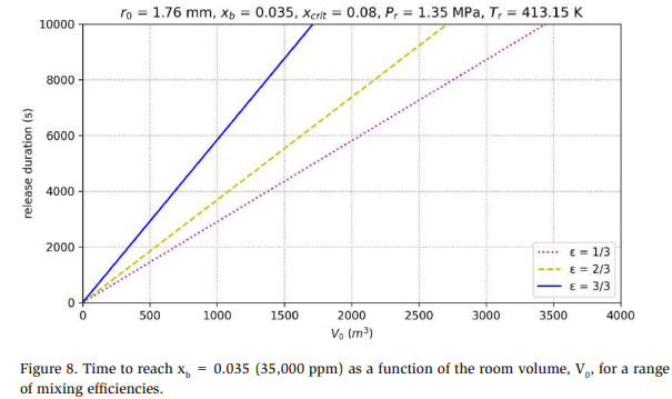 Recalling that the room fractions asymptotically approach steady state, Figure 8 presents the time required to reach xb = 0.035 (~95% of xb = 0.04) for a range of mixing efficiencies under the given conditions. The steady-state background of xb = 0.035 (35,000 ppm) is reached very slowly for all but the smallest rooms or lowest efficiencies. This suggests that using a background fraction of 0.04 for subsequent calculations is likely conservative. As a practical matter, the background fraction for the life of a release event (time before effective release mitigation) is likely much less than 0.04, indicating that Vz is also less than 0.1 m3 during this period.