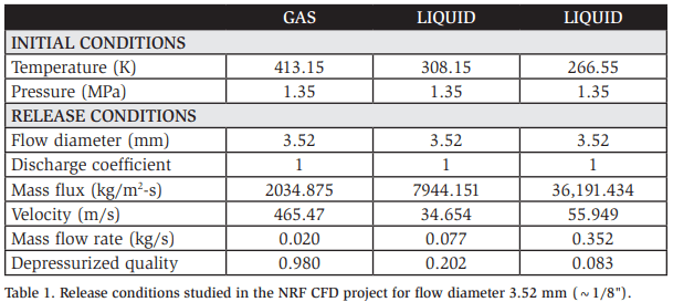 The analysis is mainly focused on the choked flow, or vapor-only release, because it forms the basis of the adopted Vz calculation. Table 1 lists the initial and final parameters calculated using REFPROP and commercially available calculation and analytical modeling software, ioMosaic SuperChems®, for the three release conditions studied in the NRF-funded CFD work using the previously identified flow diameter.
