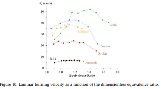 Figure 10 shows the laminar burning velocity, Su (cm/s), as a function of the dimensionless equivalence ratio. (Davis 2022) The equivalence ratio is the measured fuel mass-to-air mass ratio divided by the same ratio at combustion stoichiometry, commonly termed the leanness or richness of the mixture. Laminar burning velocity is a fundamental parameter describing how a planar flame propagates into a quiescent unburned mixture ahead of the flame at a specified test pressure and temperature. Furthermore, it contributes to the B2L classification of ammonia, where “B” is based on the toxicity level, “2 – lower flammability” is based on the LFL and heat of combustion, and “L” is the sub-category (of class 2) for a burning velocity of less than 10 cm/s. (ANSI/ASHRAE 2022)