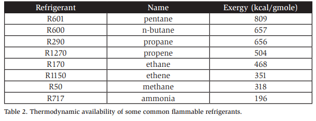 Table 2 shows the relative ignition damage potential of ammonia to other common flammable refrigerants. The exergy or thermodynamic availability indicates the maximum mechanical energy available from a material. This is the maximum amount of energy that can be transformed into an overpressure wave, the typical endpoint of ignition hazard assessments. (Crowl 1992)