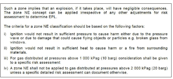 IEC 60079-10 (IEC 2020) defines a zone of negligible extent (Zone NE), Vz = 0.1 m3 , where the hazard posed by a release is deemed to be so small that significant injury or damage is not expected from ignition. (Appendix A)