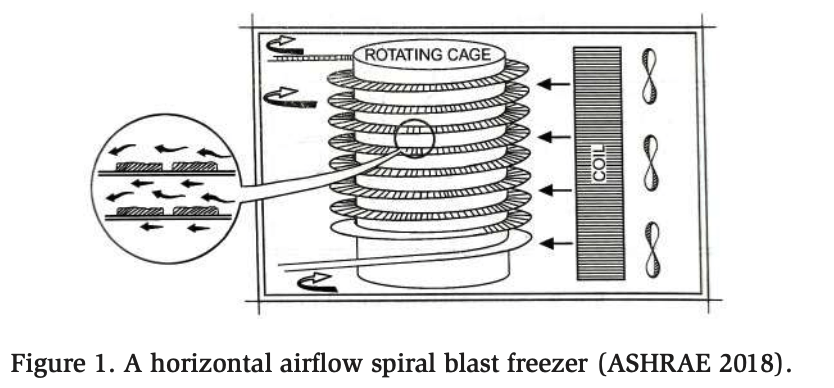 The food and beverage sector constitutes approximately one-third of the global energy consumption and one-fifth of all greenhouse gas emissions (FAO 2011). Approximately 40% of this energy usage is related to processing and distribution, with food retail and preparation compromising another 35%. Notably, “Freezing Equipment” represents the largest investment in the food production line. Lowering the refrigeration temperature in production facilities by 10°F (−12°C) can increase the utility bill by 15% (ASHRAE 2018), underscoring the impact of the freezing system. The number of food processing and distribution facilities is considerably smaller than the number of retail, preparation, and cooking operations. Moreover, these processing centers require high energy, emphasizing the need to improve energy efficiency in food processing and distribution facilities. As a result, the overall energy consumption of this important sector can be effectively reduced. The dominant form of production freezing is air blast freezing (ASHRAE 2018). This paper focuses on the spiral version, a dynamic freezer system that can be directly integrated into the food production pathway. A spiral blast freezer is illustrated in Figure 1.