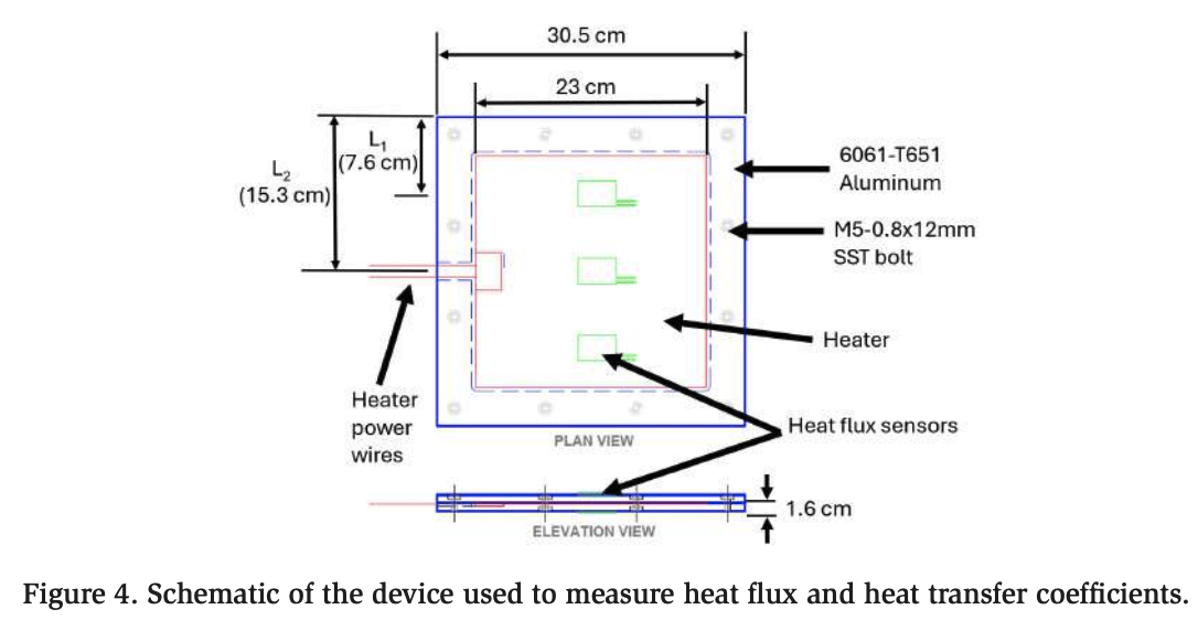 A single heat flux sensor was affixed to the top (leeward side) of the aluminum plate using double-sided thermal adhesive tape, commonly used for CPU applications. This adhesive was chosen for its durability, ease of use, and relatively high thermal conductivity compared with alternative mounting methods. The flat square geometry was used for the aluminum plate to simplify the design and calculations.