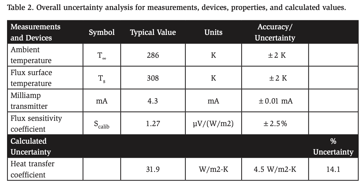 An uncertainty analysis was conducted to estimate the overall measurement accuracy of the surface heat transfer coefficient. Key components contributing to uncertainty included thermocouples, the heat flux sensor, and milliamp transmitters. The individual uncertainties for these elements were derived from manufacturer specifications or calibration data and were propagated through the calculations to determine their impact on the final heat transfer coefficient. As summarized in Table 2, the resulting uncertainty in the heat transfer coefficient was 14%.