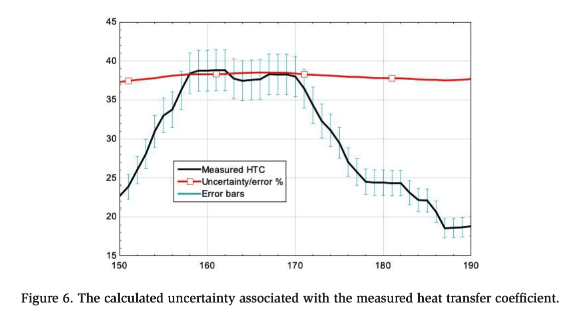 Figure 6 shows live data obtained in a spiral freezer, with the calculated uncertainty overlayed. In this example, the uncertainty is less than the listed value in Table 2 owing to the discrepancy in the temperature difference (ΔT) between the ambient spiral freezer air and the flux surface. The average error in the heat transfer coefficient is around 6.5% in Figure 6.