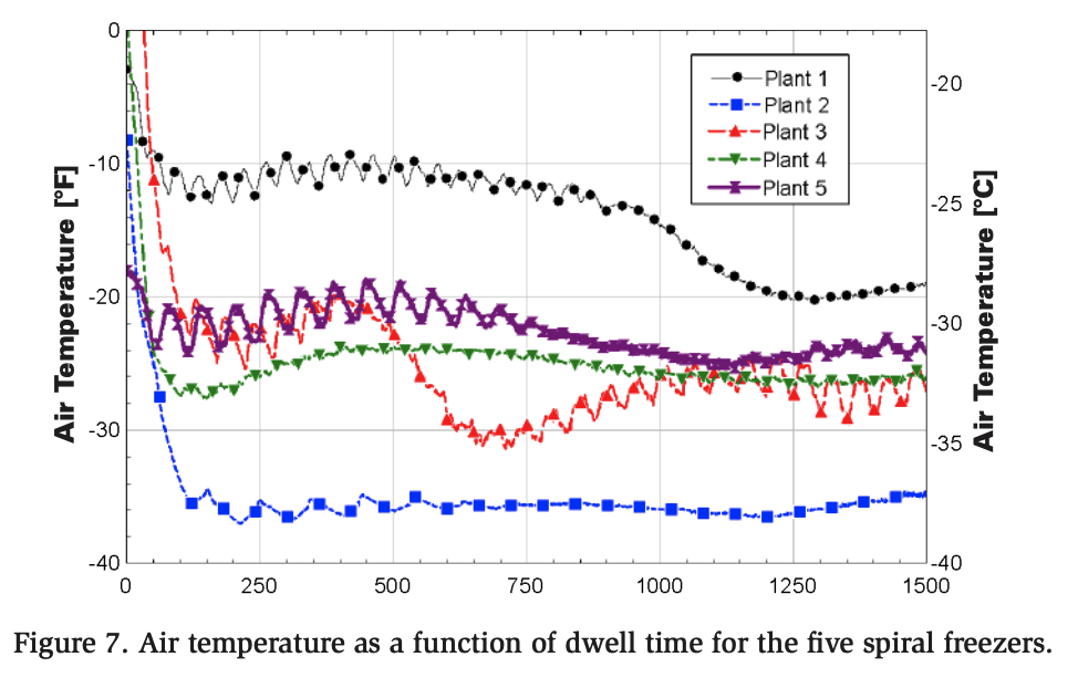 Figure 7 presents the air temperature profiles of spiral blast freezers from five different plants, highlighting significant variability across locations. The data has been truncated at 1500 seconds to make comparisons between the different freezers easier. Plant 2 exhibits the coldest air, with an average temperature of approximately −38°F (−39°C), whereas Plant 1 exhibits the warmest air, averaging around −14°F (−26°C). Plants 3, 4, and 5 have similar air temperatures, approximately −25°F (−32°C). From a performance perspective, lower air temperatures are preferable because they enable faster freezing of the products. However, achieving lower temperatures necessitates lower saturated pressures within the refrigeration system, resulting in increased energy consumption. Therefore, optimal freezer performance requires a careful balance between air temperature and airflow to achieve the most efficient throughput.
