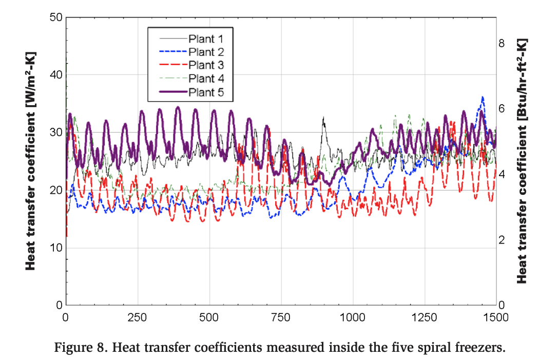 Figure 8 presents the measured heat transfer coefficients for all five spiral freezers, revealing distinct patterns across the plants. The data are presented utilizing an 8-point moving average to smooth out significant oscillations in the raw data, facilitating clearer visualization over the collection period. Plants 1 and 5 exhibit relatively high heat transfer coefficients at the start of the cooling process, which gradually taper to moderate values by the end. As discussed in a related paper, Optimizing Airflow in Spiral Blast Freezers (Alar, 2024), this is considered an optimal heat transfer profile for blast freezers. A higher heat transfer coefficient—indicative of greater air velocity—earlier in the cooling process enhances freezing efficiency.