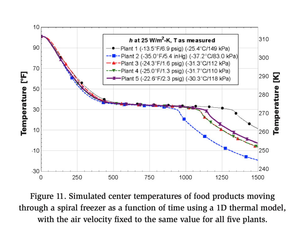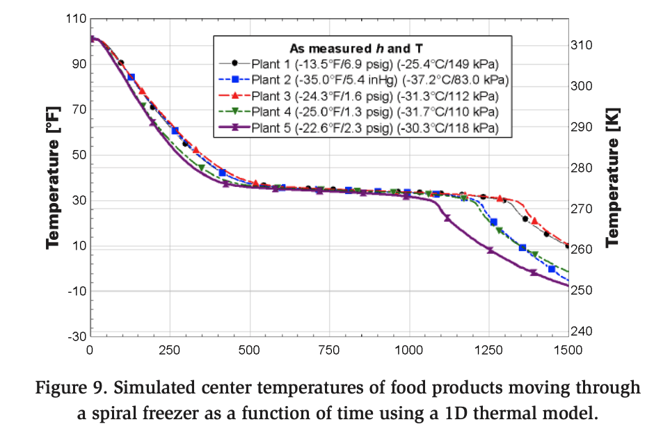 To evaluate the performance of each spiral blast freezer, the measured heat transfer coefficients and corresponding temperatures were applied as boundary conditions in a 1D thermal model of a food product moving through a spiral freezer. The results are presented in Figure 9, which also displays the saturation pressure of ammonia (R717) corresponding to the measured temperatures. The calculated center temperature of the food product upon exiting the freezer is included in the figure.