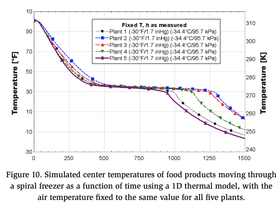 In the next analysis, the airflow velocity (heat transfer coefficient) is held constant across all five plants, allowing only the air temperature to vary based on the measured temperatures within each spiral freezer. The simulations are then repeated, as shown in Figure 11. The performance of the spiral freezers is directly correlated with air temperature, as illustrated in Figure 7. Plant 2, which had the lowest air temperature, achieved the lowest food center temperature, making it the top performer. In contrast, Plant 1, with the highest air temperature, was the poorest performer.