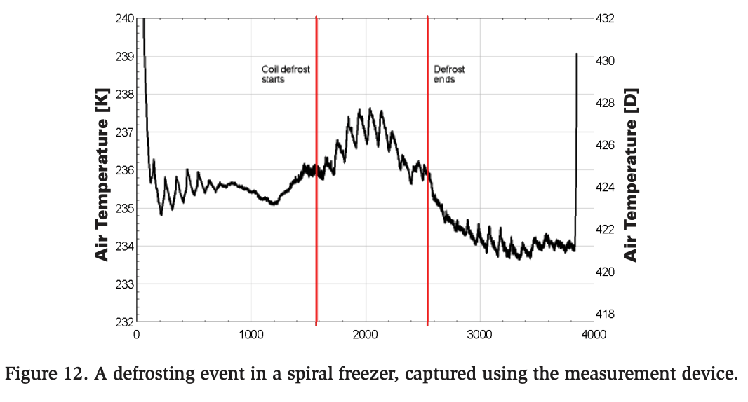 Additionally, the data obtained using the measurement device can be analyzed to examine the effects of defrosting and other phenomena on the air temperature inside a spiral freezer. Figure 12 shows the characteristics of a defrosting event captured using the measurement device.