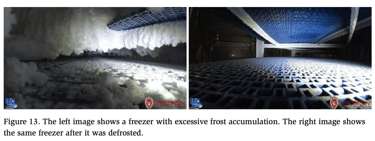 Finally, Figure 13 shows two images taken from a video captured using the action camera mounted on the measurement device. This visual feed serves as a valuable diagnostic tool for identifying operational anomalies such as excessive frost buildup, frost deposits, uneven belt transitions, and sanitation concerns. The left and right snapshots were taken at different points during the freezer’s operating cycle. The left image reveals significant frost accumulation, and the right image shows the same freezer after being warmed and defrosted a few days later, highlighting the difference in conditions before and after maintenance.