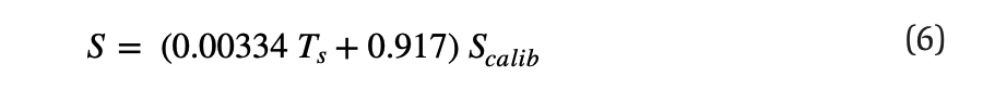 The calibration method used by the manufacturer of the heat flux sensor is based on an equation (Equation 6) that depends on the calibration sensitivity Scalib and surface temperature Ts . This sensitivity value varied from 0.00125 to 0.00134 mV/(W/m2 ) for all the flux sensors used herein. Equation 6 yields the overall sensitivity coefficient S: