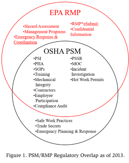 At that time, the two Federal regulations (PSM and RMP) overlapped significantly. This was intentional based on public comments received when the rules were being considered. Figure 1 shows the overlap between the two regulations as of 2013, whenboth OSHA and EPA began the process of updating their respective regulations.