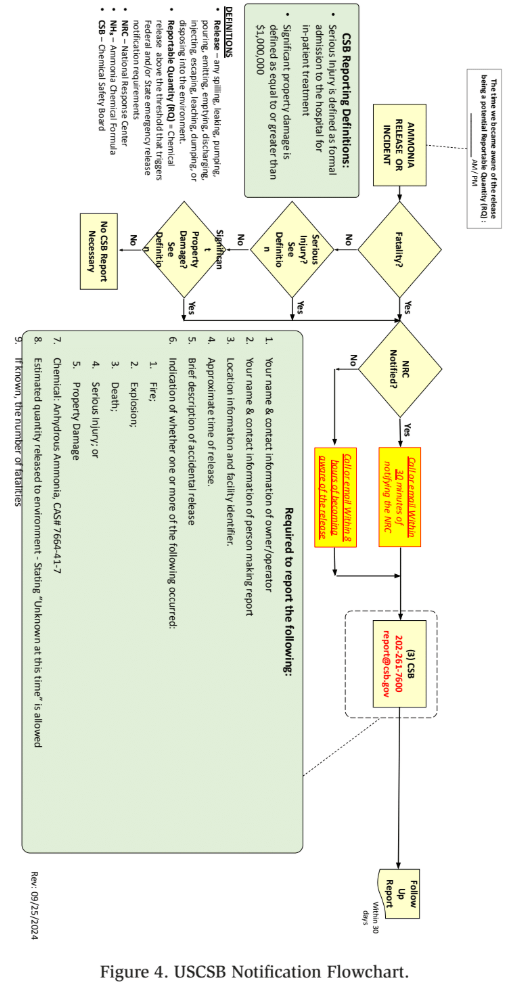 To comply with these changes, the facility’s Emergency Action Plan (EAP) must be reviewed and possibly updated. First, ensure that all agencies that may need to be notified are included in the emergency notification list. This includes the NationalResponse Center, the State Emergency Response Commission (SERC), as defined in each state, and the LEPC, as defined by each state and often by each county or city.It is important to consider that if a facility is located close to a border, there may be multiple SERCs or LEPCs that need to be notified. Some states have additional reporting requirements, often involving the Department of Natural Resources or another environmental agency. Additionally, the triggers for notifying the U.S.Chemical Safety Board (CSB) and how to do so should be included. A flowchart detailing the triggers for CSB notification is shown in Figure 4.