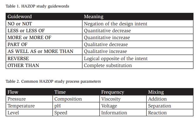 During the HAZOP study, an experienced facilitator and a team with detailed knowledge of the process being evaluated use a series of guidewords and process parameters to identify potential deviations from safe operating conditions. For example, the guideword “no” when combined with the parameter “flow” creates the deviation “no flow.” The team can then brainstorm causes that would lead to a loss of flow in the node being studied. Tables 1 and 2 demonstrate how guidewords and process parameters can be paired to create a set of deviations for a HAZOP study.