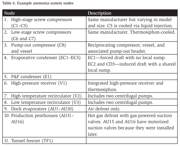 The example in Table 4 shows a relatively simple two-stage refrigeration system broken down into 11 nodes. This hypothetical system has five high-stage screw compressors, two low-stage booster compressors, one reciprocating pump-out compressor, a low-temperature recirculator, a high-temperature recirculator, a highpressure receiver, three evaporative condensers, a plate and frame (P&F) condenser, ten shipping/receiving dock ceiling hung evaporators, six penthouse units for cooling a production space, and a tunnel freezer.