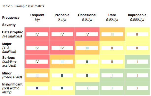 The vertical axis in Table 5 represents the severity of the consequence, ranging from catastrophic to insignificant. In this example, catastrophic severity is defined as an event resulting in more than four fatalities. From here, the consequences progressively get less severe ending with insignificant, where the worst credible consequence includes minor first aid or no injury.