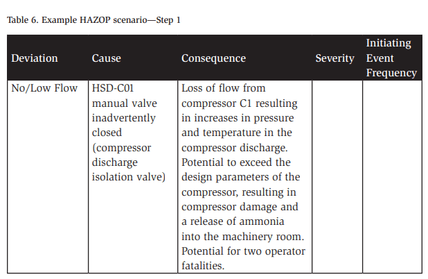 Typically, after reviewing a few examples, PHA teams quickly catch on, and cause identification becomes easier. Often, some, if not many, causes end here. That is, we accept an operational inefficiency or see no process safety consequence at all. For example, the causes can result in increased energy consumption or necessitate an earlier replacement of wear components for a particular machine, but they are not expected to result in a release of ammonia from the system. The team should document this and move on.