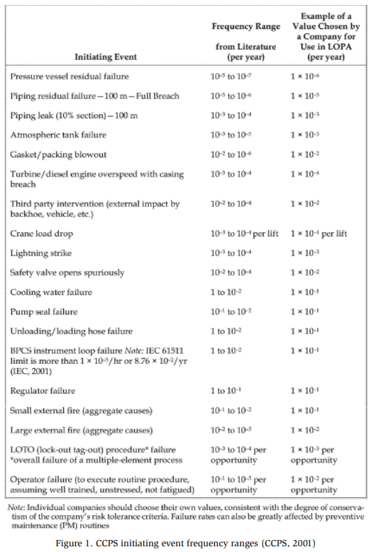 The process safety industry has spent significant effort gathering data from various sources to assist in determining equipment failure rates and initiating event frequencies. PHA teams and organizations should also consider company experience regarding equipment failure rates. In Layers of Protection Analysis: Simplified Process Risk Assessment, the Center for Chemical Process Safety (CPPS) provides typical frequencies of initiating events (Center for Chemical Process Safety, 2001), as shown in Figure 1. Note that ranges are given for each type of initiating event first, followed by the exact value a company or PHA team may choose to use in a LOPA or HAZOP study. CCPS provides additional guidance on typical frequencies in Guidelines for Initiating Events and Independent Protection Layers in Layer of Protection Analysis (Center for Chemical Process Safety, 2014)