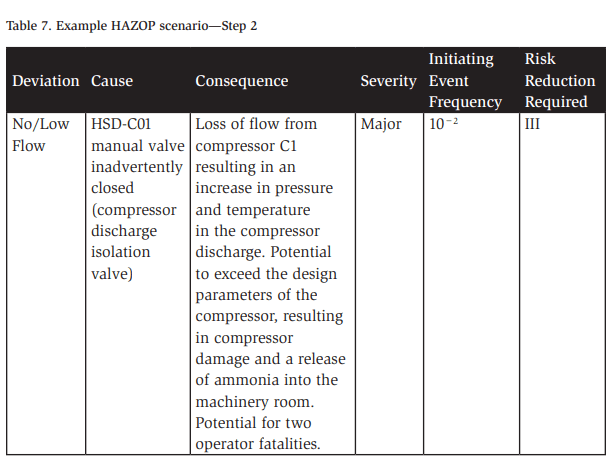 According to both Process Safety Management (PSM) and Risk Management Program (RMP) regulations, “The process hazard analysis shall address: … Consequences of failure of engineering and administrative controls” (Occupational Safety and Health Administration, 1992). As a result, PHA practitioners typically adopt a worstcase approach and assume that a scenario can progress to its ultimate consequence without the intervention of any safeguards. This can be initially challenging to many and especially challenging to experienced refrigeration and maintenance mechanics who have spent their entire careers working on the very systems they must assume will fail. However, after training and working on a few examples, most catch on very quickly. Take the following discussion as an example, building on the consequence above: