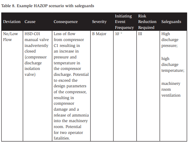 Now that we have thoroughly reviewed safeguard and their efficacy, we can wrap up the discussion on safeguards by returning to our example, as updated in Table 8. Now, we can certainly include the high discharge pressure cutout device, but we raise some important questions regarding independence for the compressor discharge temperature safety and the effectiveness of the machinery room ventilation. Clearly, what initially might have been a long list of possible safeguards to prevent a compressor overpressure event is reduced to only three (as the PSV is not sized for the full flow of the compressor). This illustrates the importance of a thorough analysis of safeguards in a PHA