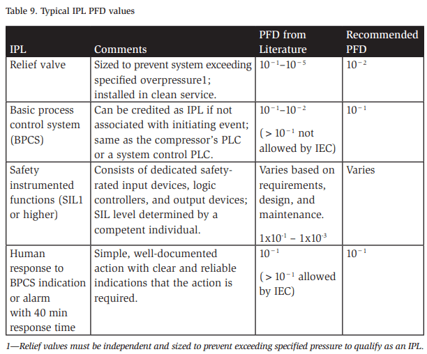 Next, the LOPA team must assess the overall reliability of identified IPLs by assessing their PFDs. For most LOPA practitioners, these PFD values can be obtained from industry literature such as CCPS’s Layer of Protection Analysis. Some commonly used IPLs in ammonia refrigeration systems and their PFDs are given in Table 9 (Center for Chemical Process Safety, 2001).