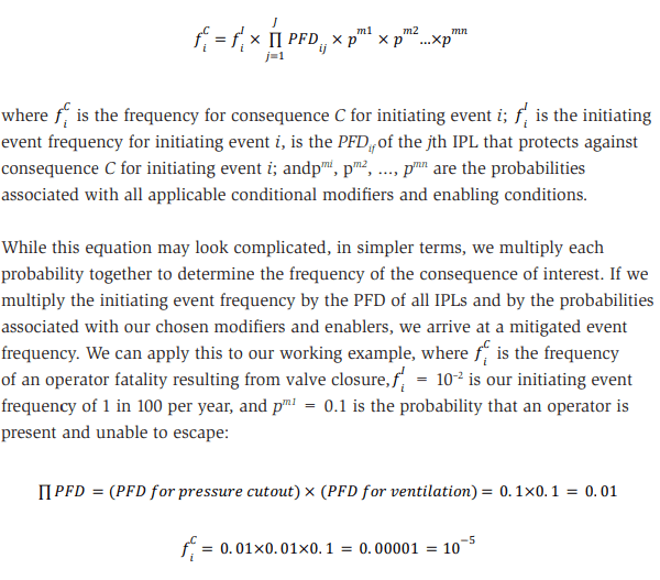 To ascertain the frequency, we multiply the initiating event frequency by the product of the IPL PFDs and the probabilities of the applicable modifiers and enabling conditions. The formula below represents this in formulaic notation: