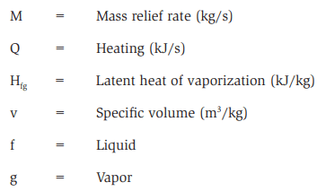The boiling mass flow rate, which forms the basis of current safety standards, is given by the ratio of heating to the latent heat of vaporization for the relieving condition. For this expression, we can add the conventional correction term for volume change of the two phases during boiling in the fixed volume vessel,5 which is neglected by many safety standards.6