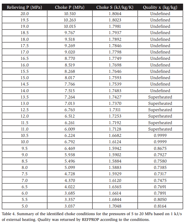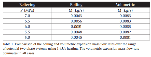 As a preliminary first step for a two-phase system, it is important to determine whether boiling is the dominant mass flow process. Table 1 shows the two values with 1-kJ/s heating for the range of potential two-phase relieving pressures.
